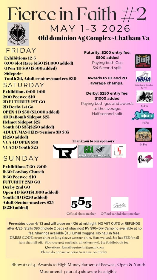 Pre-entries open 4/13 and close 4/26 at midnight. NO VET OUTS or REFUNDS after 4/25. Stalls $90 (include 2 bags of shavings), RV $90. Dry camping available at no fee. Shavings available $10. Email Coggins. No haul in fees. DRESS CODE: event shirt or long sleeve western shirt. Hats waived. $15 hat FEE for all hats that fall off. $15 race age payback, all others 75%. $15 Saddlebook fee. Please do not arrive prior to 11 a.m. on Friday. Show #2 of 4 - Awards to High Money Earners of Peewee, Open & Youth. Must attend 3 out of 4 shows to be eligible.