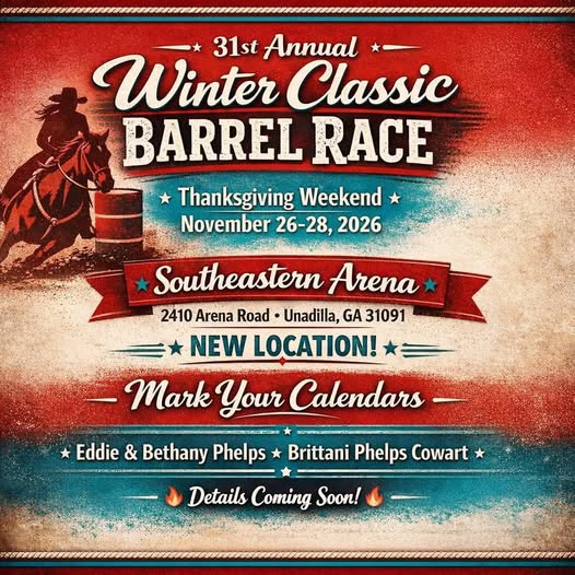 31st Annual Winter Classic Barrel Race taking place Thanksgiving Weekend at a new location - Southeastern Arena in Unadilla, GA. This is a multi-day event running November 26-28, 2026. Details coming soon. Produced by Eddie & Bethany Phelps and Brittani Phelps Cowart in association with Roger Odom.