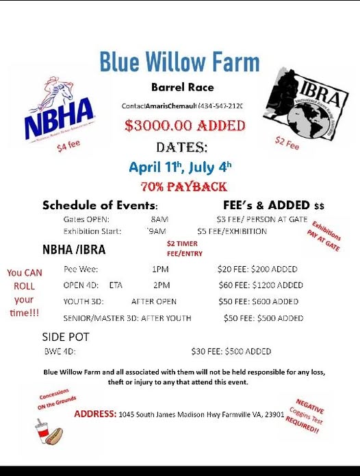 Blue Willow Farm and all associated with them will not be held responsible for any loss, theft or injury to any that attend this event. Concessions ON site. You CAN ROLL your time!!! $4 NBHA fee, $2 IBRA fee. Phone number may be incomplete on flyer.