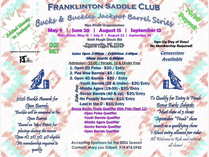 Rain Date: May 16. Sign-up day of show, no membership required. 2026 Buckle Awards for Open Barrels based on most points for placing during the season. Arena maintenance by Rouse Res-Q. Bonus Bucks Finals Qualifier Side Pots (Sept 12): Open Poles Qualifier, Youth Barrels Qualifier, Middle Agers Qualifier, Senior Barrels Qualifier, Open Barrels Qualifier. To qualify for entry to finals: Ride in 4 out of 6 groups, September Finals show counts as a qualifying show, 1 Ghost entry allowed per rider. Must sign up by Sept 26. All welcome to ride and enter at all shows!