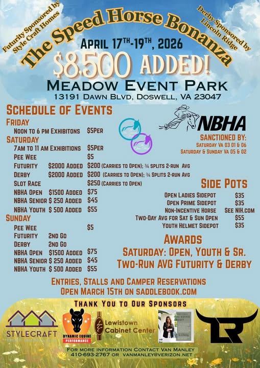 Entries, stalls and camper reservations open March 15th on Saddlebook.com. NBHA sanctioned event. Side pots available: Open Ladies Sidepot ($15), Open Prime Sidepot ($35), Non-Incentive Horse (see rulebook), Two-day average for Sat & Sun Open ($55), Youth Relay Race ($35). Event is Virginia State Shootout Incentive Series Sponsored by Skylan Homes. Thanks to sponsors: Stylecraft, O'Mara's Equine Veterinary Service, Lewistown Cabinet Center, Turnout by Lynne, and LR.