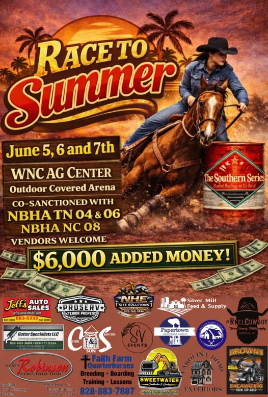 Race to Summer barrel racing event co-sanctioned with NBHA TN 04 & 06, NBHA NC 08. The Southern Series event with $6,000 added money. Vendors welcome.
