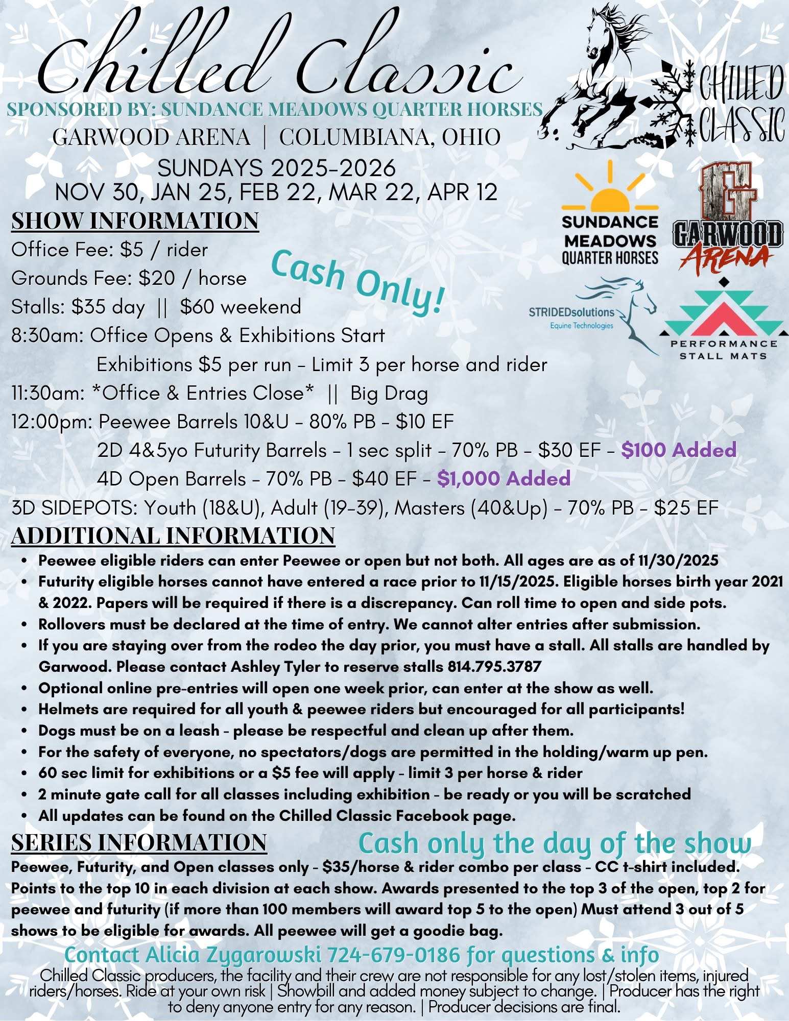 Chilled Classic barrel racing series FINALS sponsored by Sundance Meadows Quarter Horses. Cash only! Office Fee: $5/rider, Grounds Fee: $20/horse, Stalls: $35/day or $60/weekend. Events include: Peewee Barrels 10&U (80% PB, $10 EF), 2D 4&5yo Futurity Barrels 1 sec split (70% PB, $30 EF, $100 Added), 4D Open Barrels (70% PB, $40 EF, $1,000 Added), 3D Sidepots: Youth (18&U), Adult (19-39), Masters (40&Up) (70% PB, $25 EF). Exhibitions $5/run (limit 3 per horse and rider). Office opens 8:30am, closes 11:30am. Big Drag at 11:30am. Peewee Barrels start at 12:00pm. Series awards presented to top 3 of open, top 2 for peewee and futurity. Must attend 3 out of 5 shows to be eligible for awards. Contact: Alicia Zugarowski 724-679-0186
