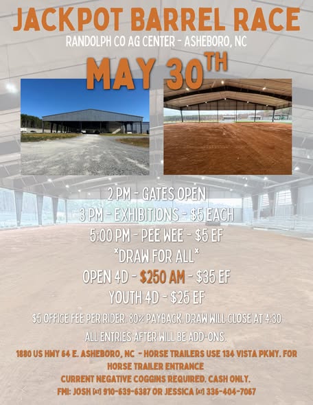Jackpot Barrel Race at Randolph Co Ag Center in Asheboro, NC. Schedule: 2 PM - Gates Open, 3 PM - Exhibitions ($5 each), 5:00 PM - Pee Wee ($5 EF) *Draw for All*, Open 4D - $250 AM ($35 EF), Youth 4D - $25 EF. $5 office fee per rider. 80% payback. Draw will close at 4:30. All entries after will be add-ons. Horse trailers use 134 Vista Pkwy for horse trailer entrance. Current negative Coggins required, cash only. Horse trailers use 134 Vista Pkwy for horse trailer entrance. Current negative Coggins required. Cash only. $5 office fee per rider. 80% payback. Draw will close at 4:30, all entries after will be add-ons.